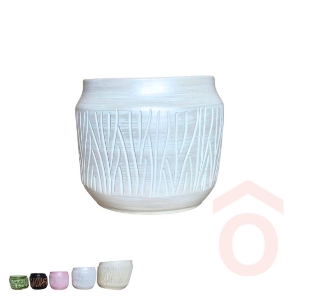 Elegáns, kézműves kerámia kaspó finoman domborított ágmintával. Elérhető öt dekoratív színben (zöld, fekete, rózsaszín, fehér, krém) és több méretben, hogy minden beltéri növényhez jól illeszkedjen.
