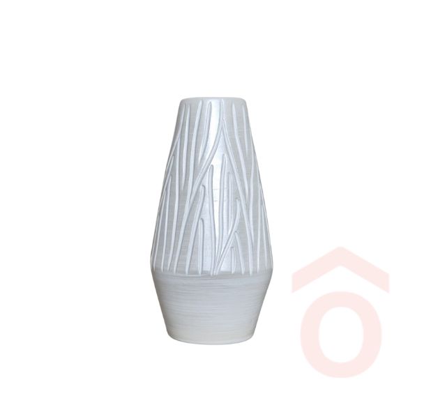 Elegáns, kézzel formázott kerámia váza finom, domborított növényi mintázattal. Fényes mázzal bevonva, modern és letisztult dekorációs elem bármely otthoni vagy irodai térbe.