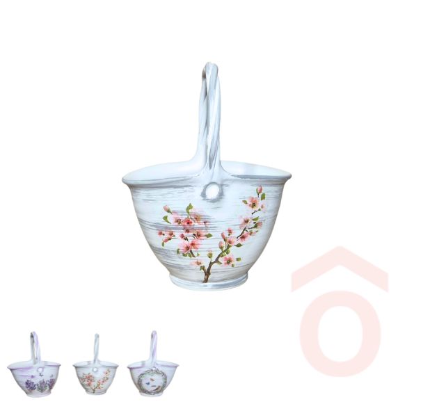 Elegáns, kézzel festett kerámia kosár fogantyúval és szellőző virágmintákkal. Dekoratív tároló otthoni vagy irodai használatra – három mintával (levendula, cseresznyevirág, tavaszi koszorú), a választék a raktárkészlettől függően változhat.