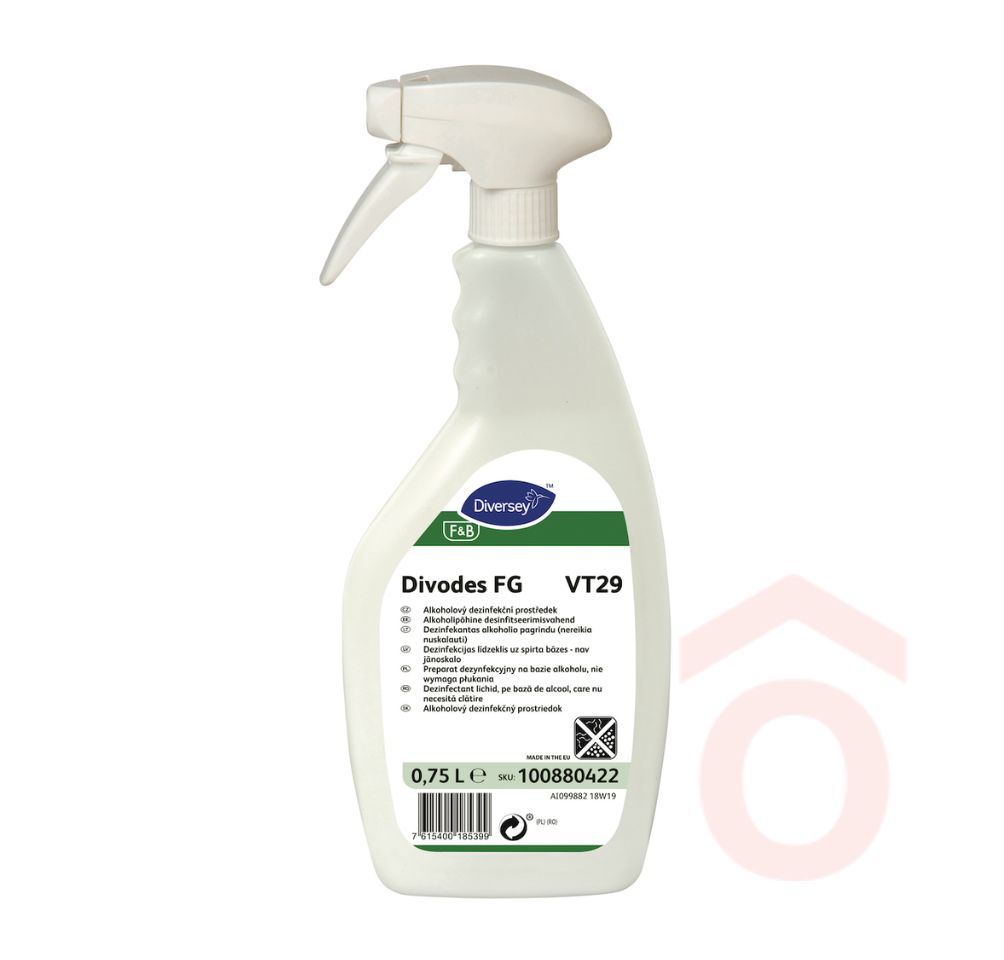 A Divodes FG egy használatra kész, alkohol alapú fertőtlenítő spray, amelyet kifejezetten élelmiszer- és italipari környezetbe terveztek. Gyorsan párolog, nem hagy foltot, és biztonságosan használható élelmiszerrel érintkező felületeken. Ideális megoldás gépek, szállítószalagok, töltők, vízre érzékeny alkatrészek, vágódeszkák, valamint pultok, eszközök köztes vagy műszak utáni fertőtlenítésére. Nem habzik, így nedvességre érzékeny területeken is alkalmazható, és öblítést sem igényel, ha a kezelt felületre hagyjuk rászáradni.