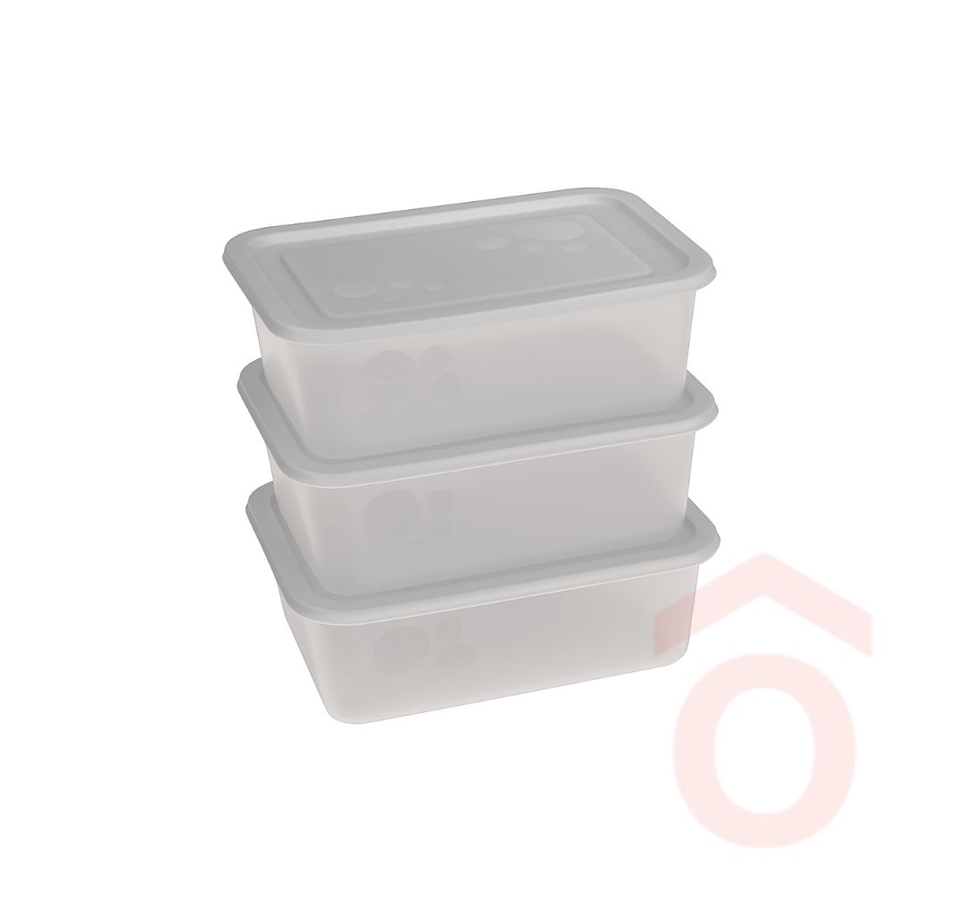 A szett 3 darab dobozt tartalmaz, így egyszerre többféle étel vagy alapanyag tárolása is megoldható. A kompakt, szögletes forma segíti a helytakarékos tárolást, a zárható fedél pedig megőrzi az ételek frissességét és aromáját.