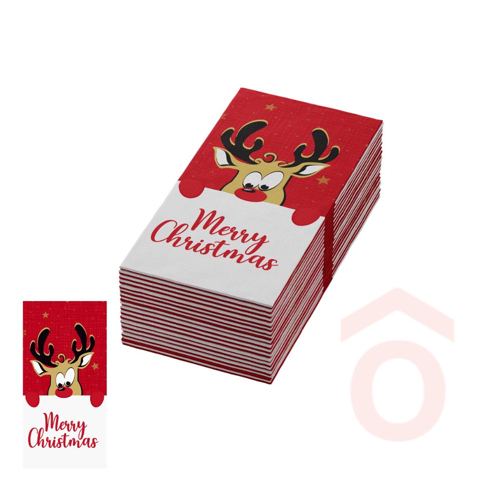 Előre hajtogatott, textilhatású Bio Dunisoft® szalvéta vidám Rudolf mintával. Időtakarékos és kényelmes megoldás, ha rövid idő alatt több terítést kell elkészíteni – ideális kötetlen reggelihez, ebédhez vagy snackszünethez.