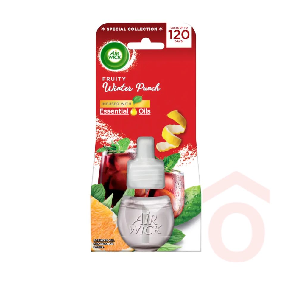 Az Air Wick elektromos légfrissítő utántöltő gyümölcsös puncs illattal igazi téli, meghitt hangulatot varázsol otthonába. Formulája természetes illóolajok hozzáadásával készült, így autentikus, édesen fűszeres illatélményt nyújt. A gyümölcsös puncs, a fahéj és a szegfűszeg kombinációja barátságos, hívogató atmoszférát teremt a nappaliban, hálószobában vagy akár az előszobában is.