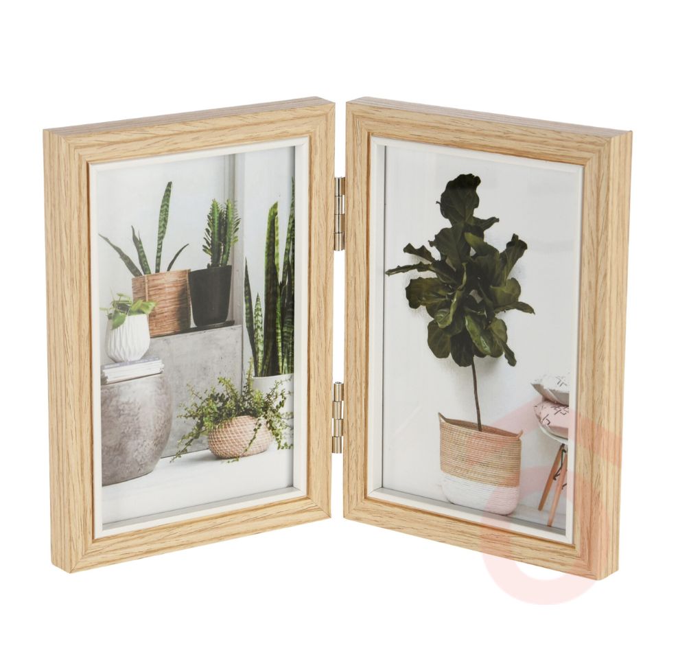 A 17×24 cm-es nyitható képkeret elegáns, természetes fa hatású kerettel készül, amely letisztult megjelenést kölcsönöz bármilyen enteriőrnek. A kétoldalas kialakításnak köszönhetően egyszerre két fotót helyezhet el benne, így ideális családi képekhez, emlékekhez vagy dekorációs összeállításokhoz.