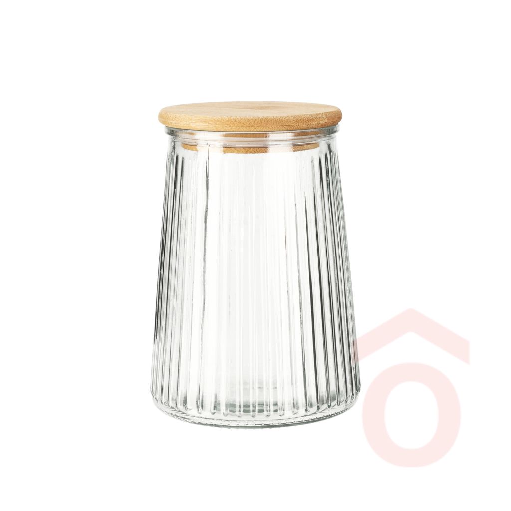 Az üveg tárolóedény praktikus és elegáns megoldás a konyhai alapanyagok rendszerezésére. A bordázott üveg kialakítás modern megjelenést kölcsönöz, miközben a természetes bambusz fedél stílusos és természetes hatást biztosít a konyhában.
