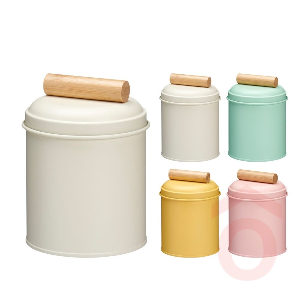 A fém tárolóedény praktikus és dekoratív megoldás a konyhai alapanyagok rendszerezésére. A modern, pasztell színek és a természetes bambusz fogantyúval ellátott fedél elegáns megjelenést kölcsönöznek a konyhapulton vagy polcon.