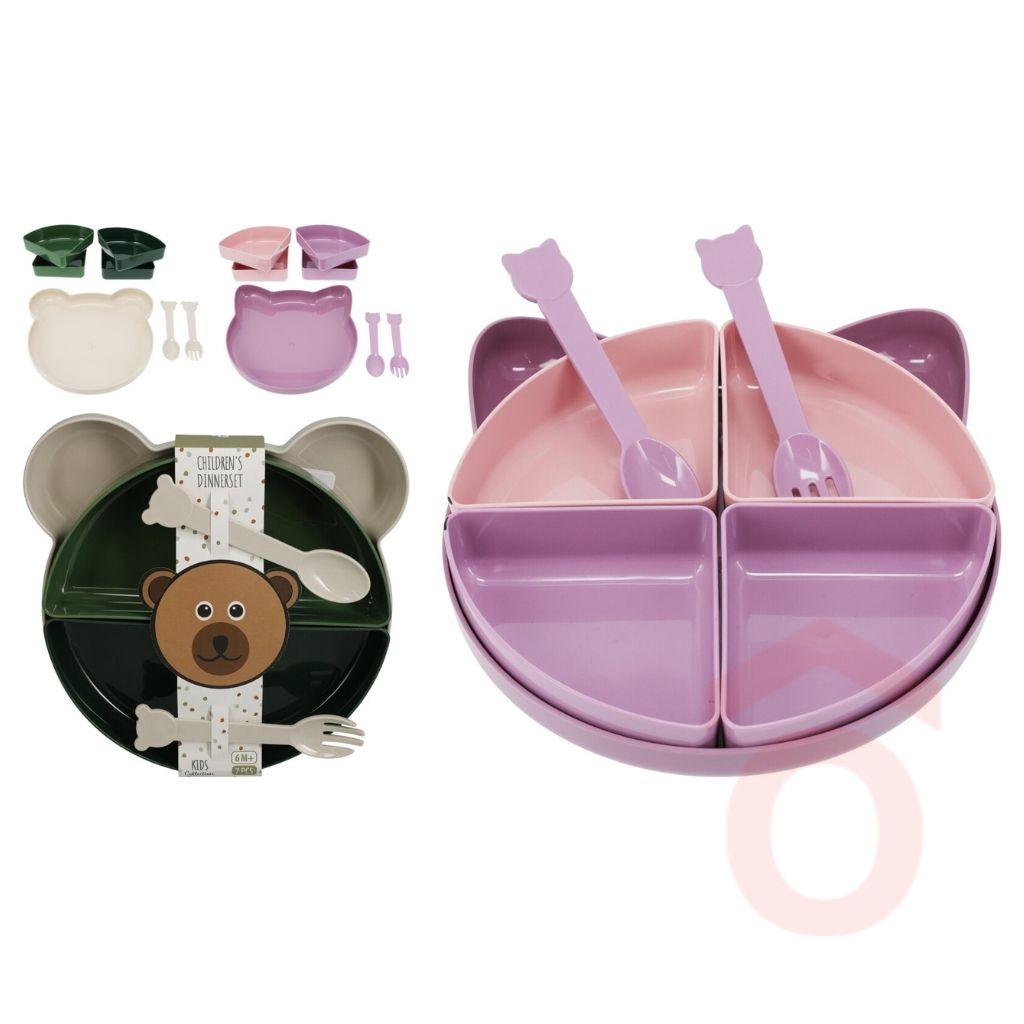 A készlet több rekeszes tányért, tálkákat és evőeszközöket tartalmaz, amelyek megkönnyítik az ételek elkülönítését. A könnyű és tartós műanyag anyag biztonságos és praktikus mindennapi használatra.