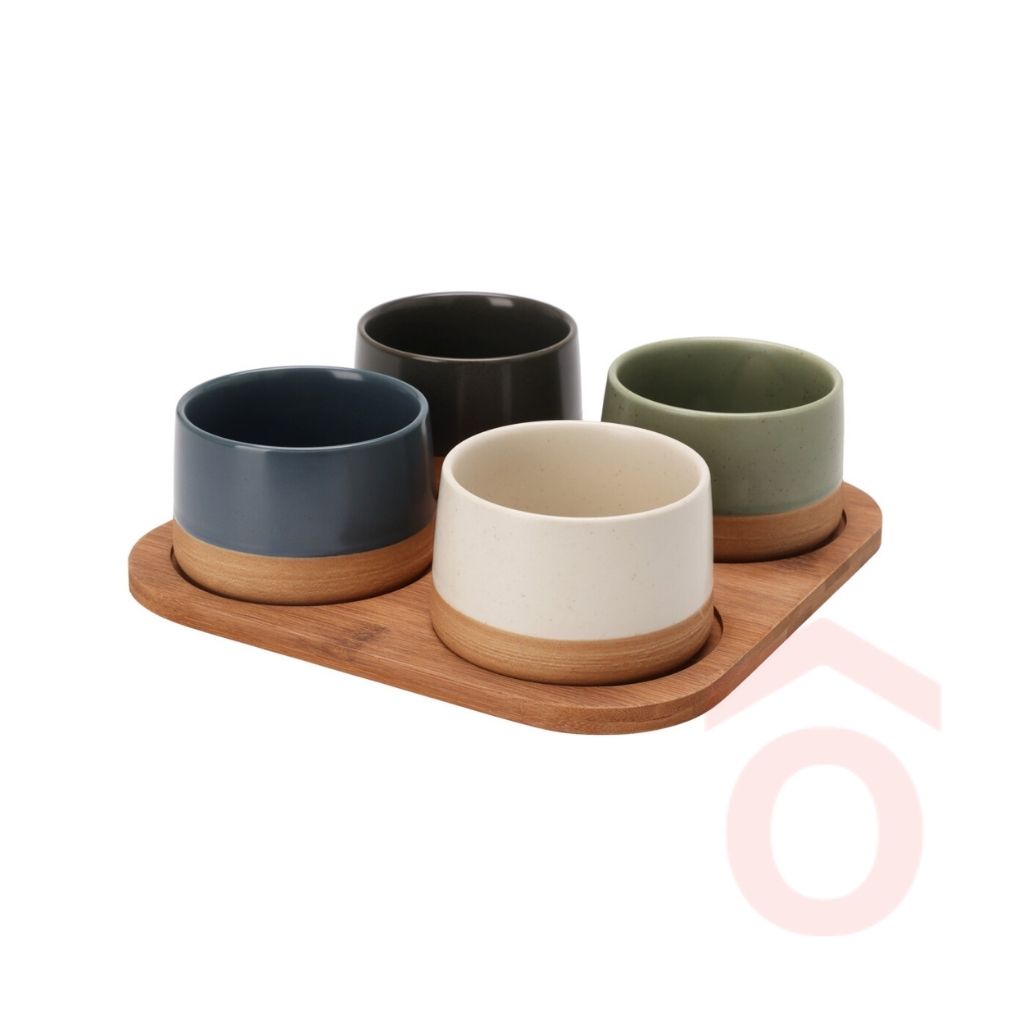 A szett négy különálló tálkát és egy stabil bambusz tálcát tartalmaz, amely rendezetten tartja a tálakat. Ideális vendégváráshoz, családi étkezésekhez vagy snackek, olívabogyó, mártogatósok és kisebb falatok tálalásához.