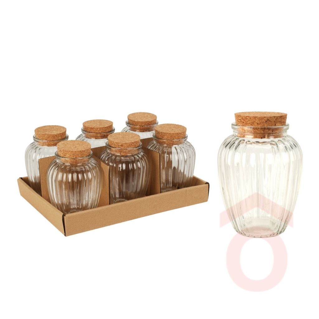 Az üveg fűszertartó parafa dugóval praktikus és dekoratív megoldás a különböző fűszerek rendszerezett tárolására. Az átlátszó, bordázott üveg kialakítás lehetővé teszi a tartalom gyors felismerését, miközben stílusos megjelenést ad a konyhapulton vagy a polcon.