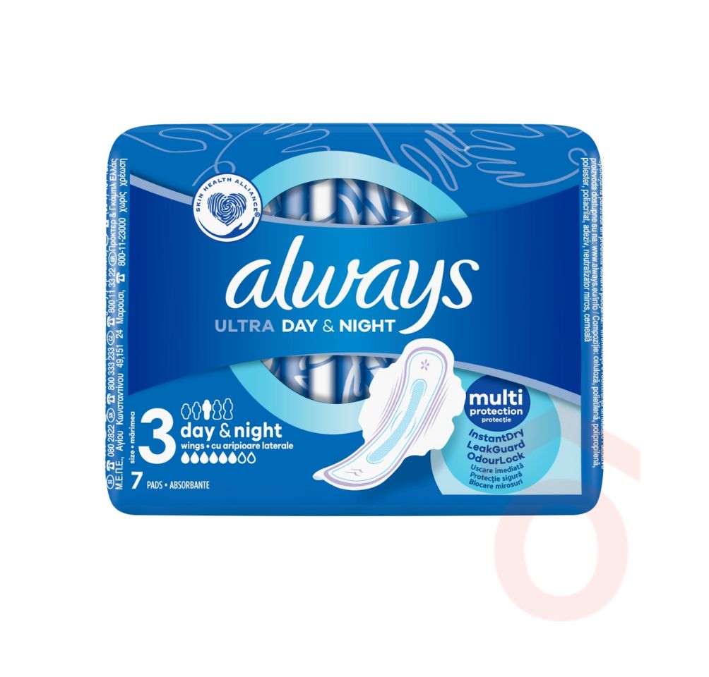 Az Always Ultra Day & Night szárnyas egészségügyi betét hármas védelmet nyújt: gyors nedvszívás, szivárgás elleni védelem és hatékony szagsemlegesítés. A legújabb technológia biztosítja a megbízható komfortérzetet akár egész napon vagy éjszakán át.