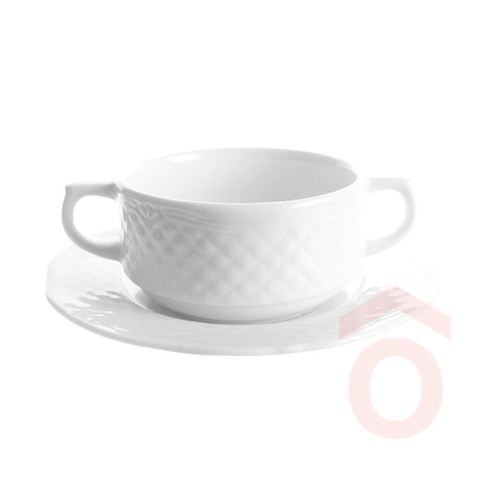 Az Afrodyta porcelán levescsésze elegáns és letisztult megjelenésével bármilyen asztalteríték tökéletes kiegészítője. Az apró kockákból álló, négy soros díszítés klasszikus, mégis visszafogott eleganciát kölcsönöz a csészének, így alkalmas éttermekbe, szállodákba vagy otthoni használatra egyaránt.
