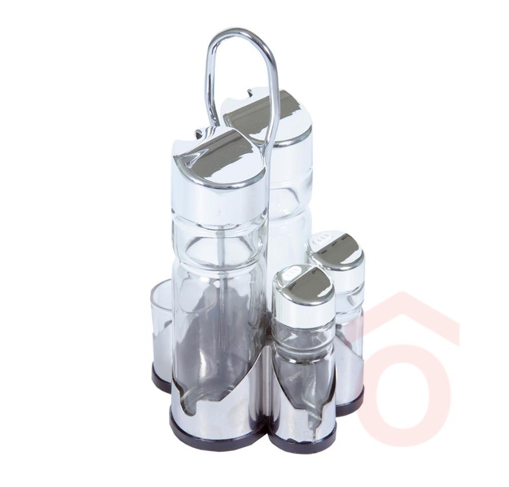 Asztali fűszertartó készlet, 5 részes. Só, bors, olaj, ecet és fogvájó tartó fém állványon.