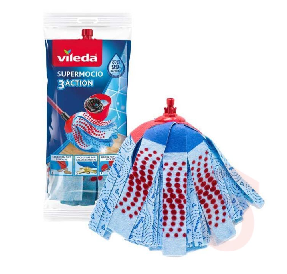 A Vileda SuperMocio 3Action gyorsfelmosón 3 különböző felület van, amelyek kiváló nedvszívók és hatékonyan tisztítanak. A piros szálak eltávolítják a makacs szennyeződéseket, de nem karcolnak; a sötétkék mikroszálas felület eltünteti a zsíros szennyeződést; a 3D FLOCK szálak a piros pöttyökkel pedik felszedik a szőrszálakat és a koszt.