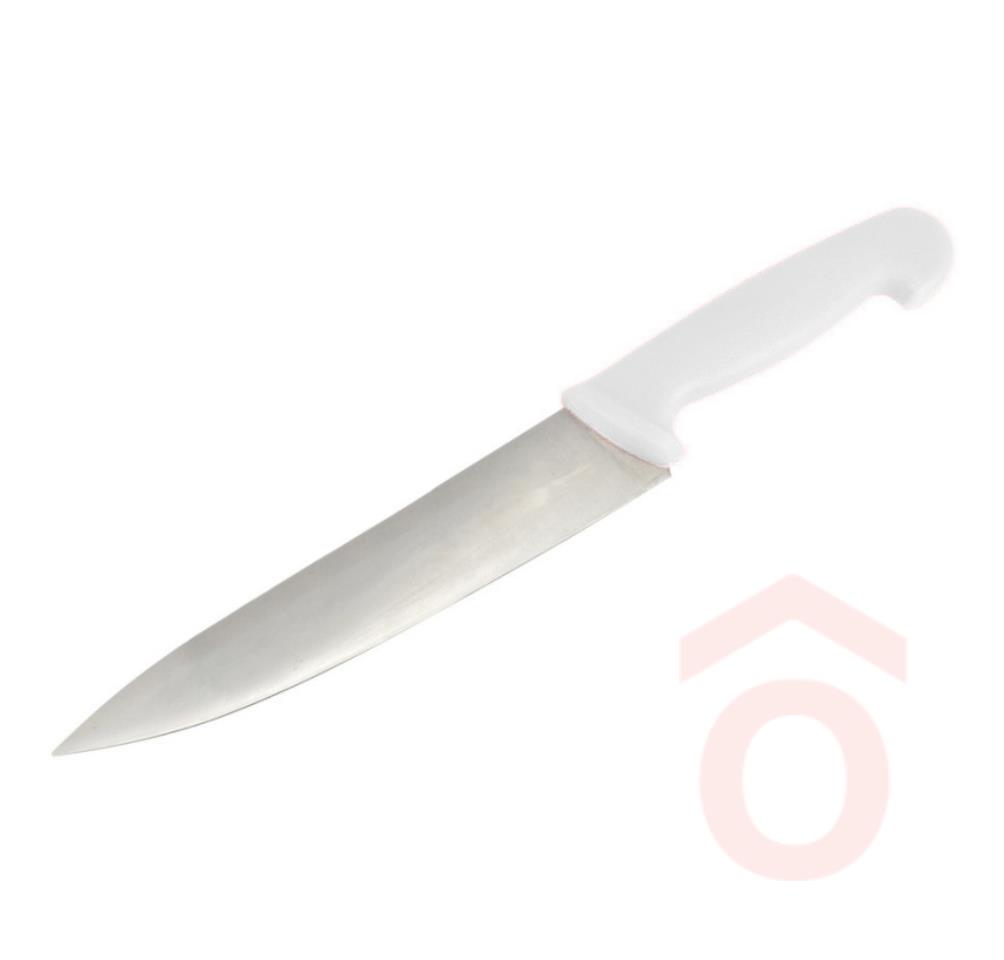 Rozsdamentes acélból készült szakács kés penge hossza 25 cm, teljes hossza 37,5 cm, fehér színű műanyag nyéllel. Karcmentes, folyékony mosószerrel tisztítható.