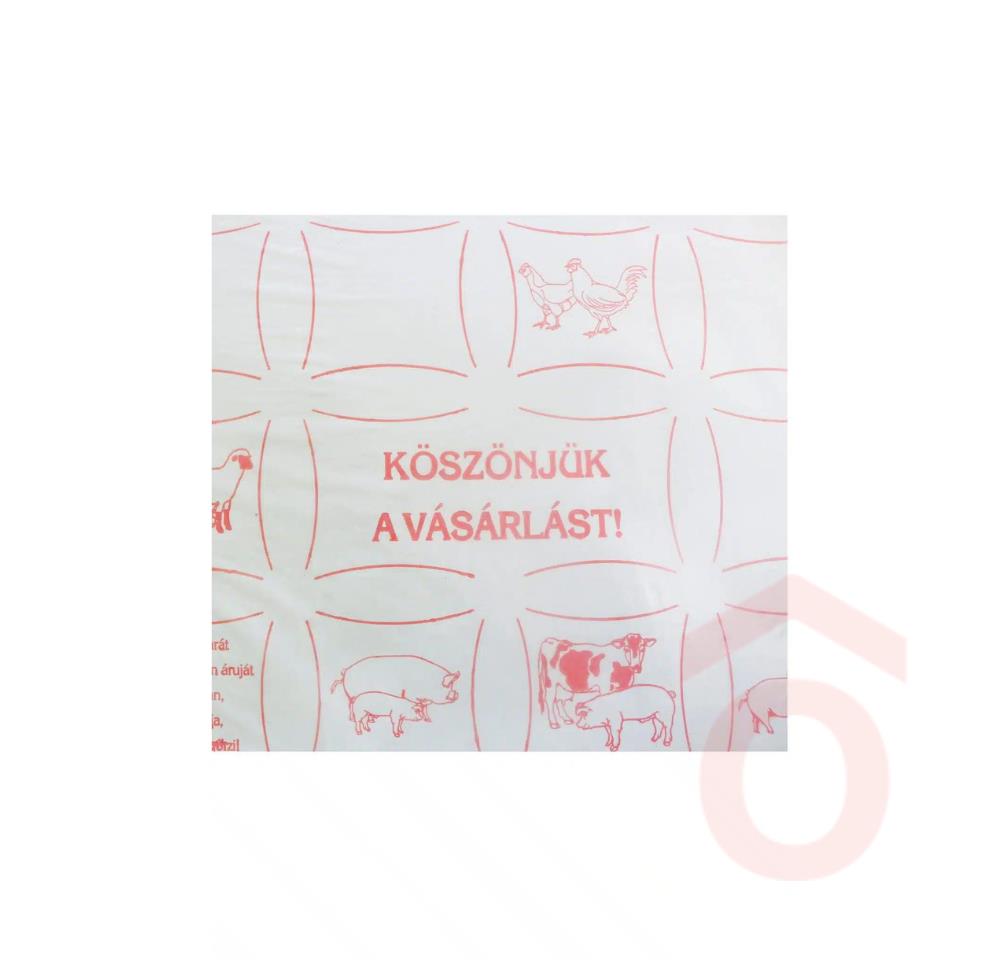 Húsok, felvágottak csomagolására alkalmas fóliázott papírív nyomott mintával. Terméktípus: húscsomagoló Kiszerelés: 5 kg Méret: 30 x 27 cm Szín/minta: lsd. a termékfotón
