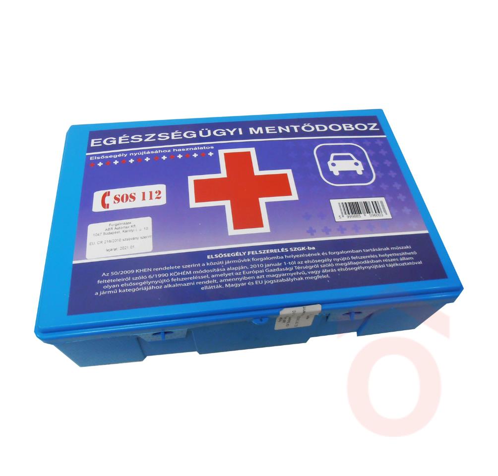 Hivatalos elsősegély doboz, egész EU-ban elfogadott rendszer alapján. Alkalmas minden B kategóriás jogosítvánnyal vezethető járműbe.