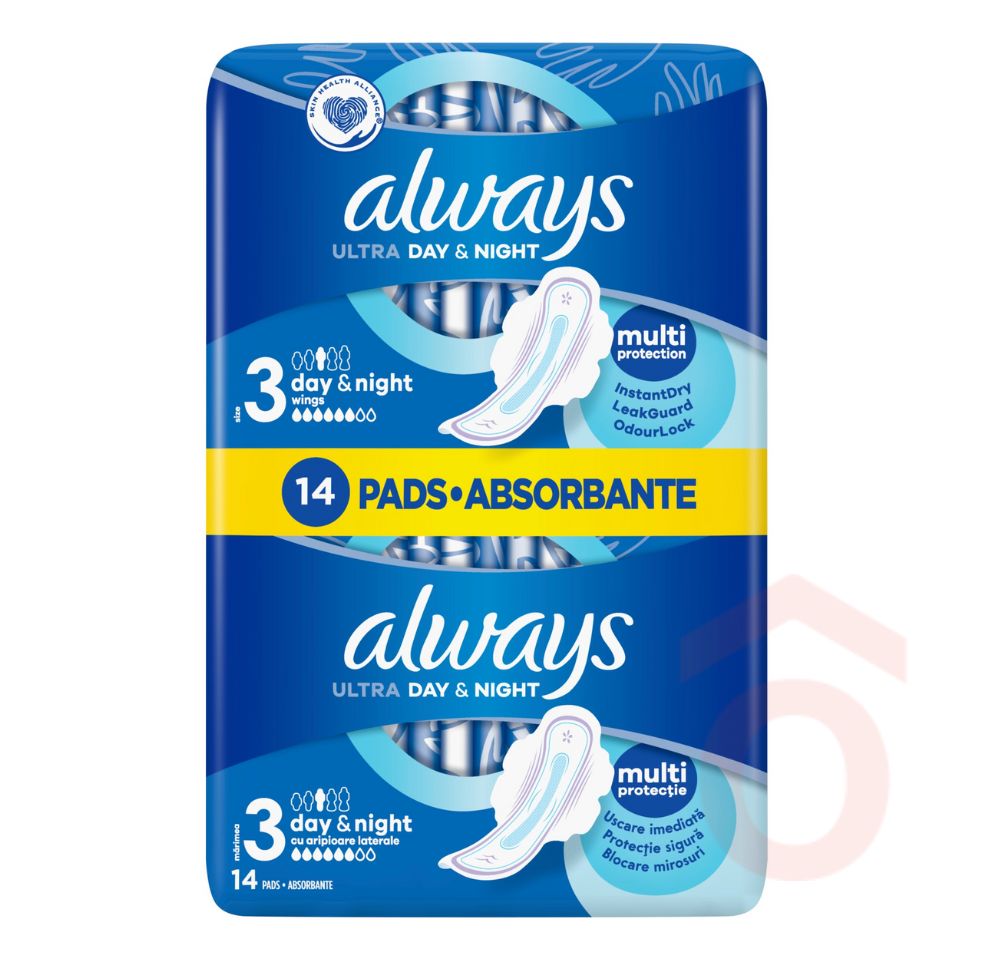Az Always Ultra Day & Night szárnyas egészségügyi betét a legújabb technológia alkalmazásával kínál hármas védelmet a mindennapok és az éjszakai használat során is. A kényelem, biztonság és frissesség tökéletes egyensúlyát nyújtja.