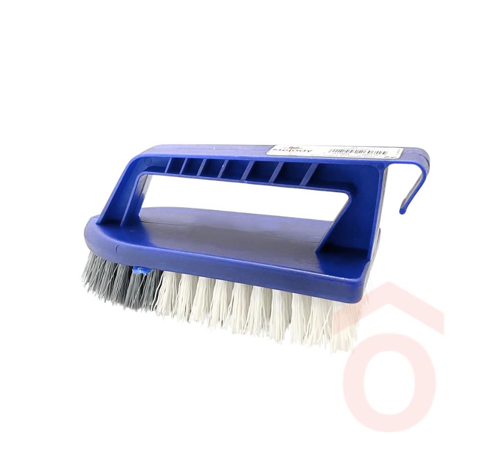 Fogantyús, műanyag súroló kefe, műanyag szálakkal, nélkülözhetetlen takarítóeszköz a foltok és szennyeződések eltávolításához.