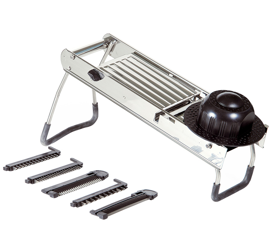 Mandolin szeletelő. Anyaga rozsdamentes acél és műanyag. Hosszúsága 40 cm, átmérője 12,5 cm. Zöldségek, gyümölcsök és hús szeletelésére is alkalmas. 5db cserélhető vágólappal rendelkezik. Gyors és hatékony szeletelés.