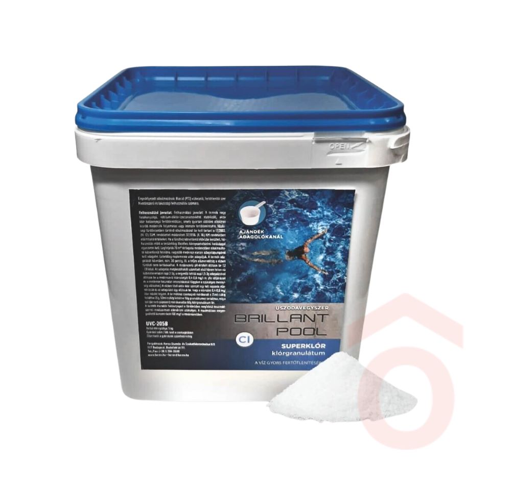 A Brillant Pool superklór granulátum 5 kg-os kiszerelése ideális választás közepes és nagyobb medencék fertőtlenítéséhez. 56% aktív klórtartalma gyors és hatékony vízkezelést biztosít anélkül, hogy megemelné a víz pH-értékét. A nátrium-diklór-izocianursav stabilizálja az aktív klórt, megnövelve annak tartósságát.