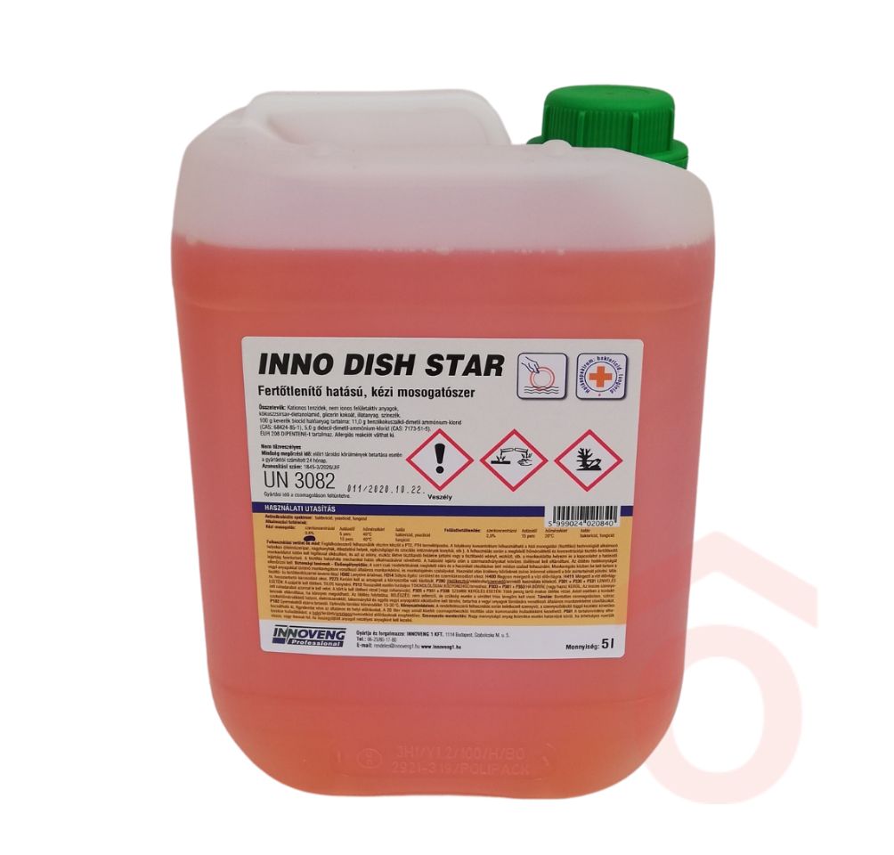Az Inno Dish Star kézi fertőtlenítő mosogatószer nagy kiszerelésű, gazdaságos megoldás élelmiszeripari, közétkeztetési, egészségügyi és szociális intézmények számára. A koncentrátum hatékonyan tisztítja és fertőtleníti az edényeket, eszközöket és munkafelületeket.