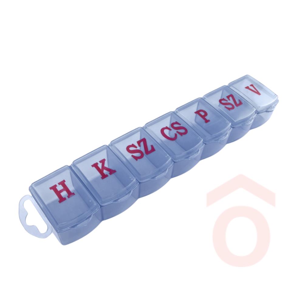 Műanyag, heti gyógyszeradagoló, 1 rekesz egy napi adag gyógyszerre szolgál. Napok kezdőbetűjével (magyar) jelölve az adott napot, a 7 db fakk külön nyitható és zárható.