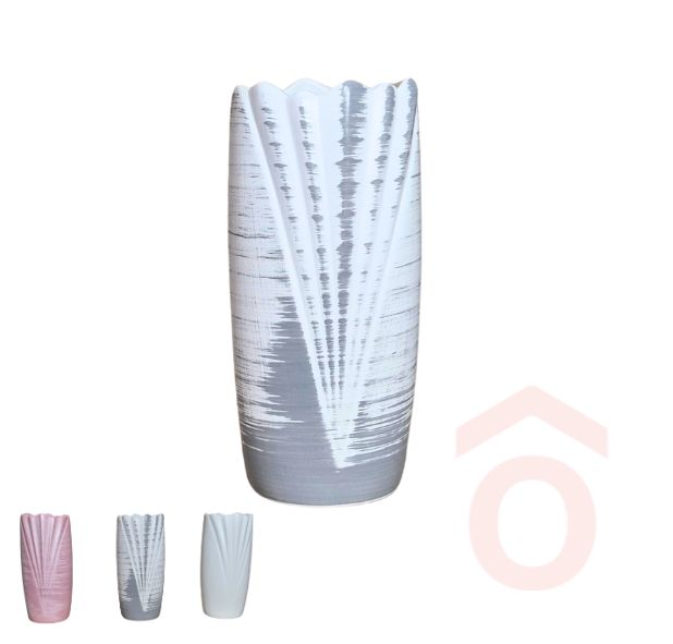 Elegáns, kézzel formázott kerámia váza bordamintás felülettel és hullámos peremmel. Kapható három dekoratív színben (fehér, rózsaszín, szürke), a választék a raktárkészlettől függően változhat.