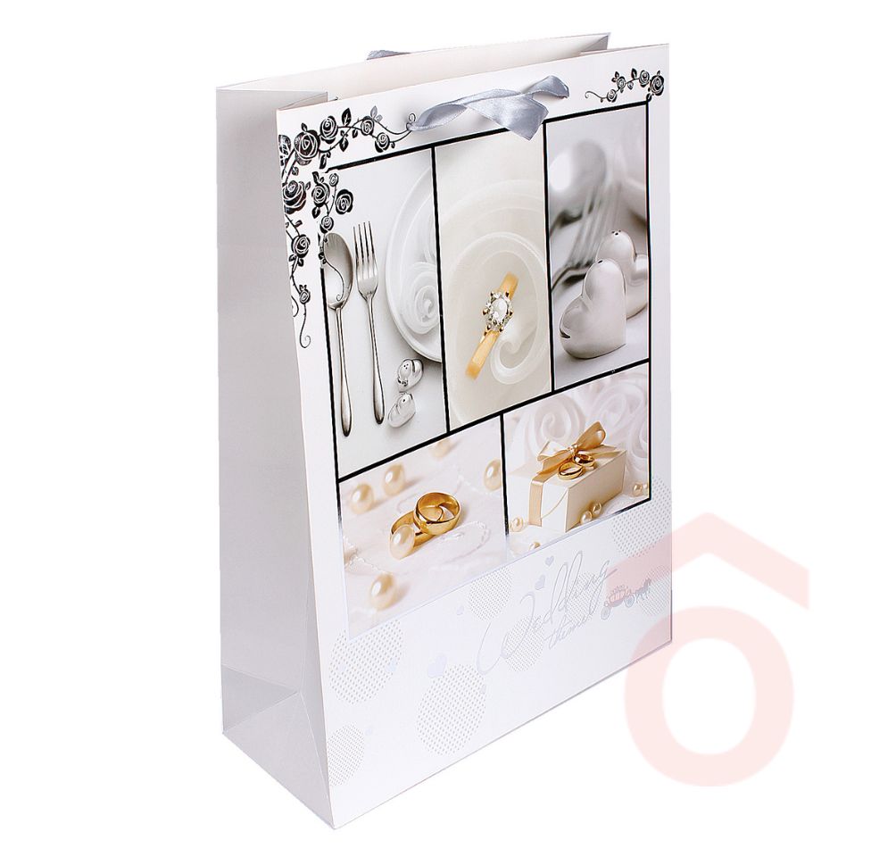 Elegáns, ünnepi megjelenésű ajándéktasak, amelyet fényes hatású, ezüst színű szalagfül tesz különlegessé. Tökéletes választás esküvőkre, eljegyzésekre vagy nászajándék átadására, amikor az első benyomás is számít.