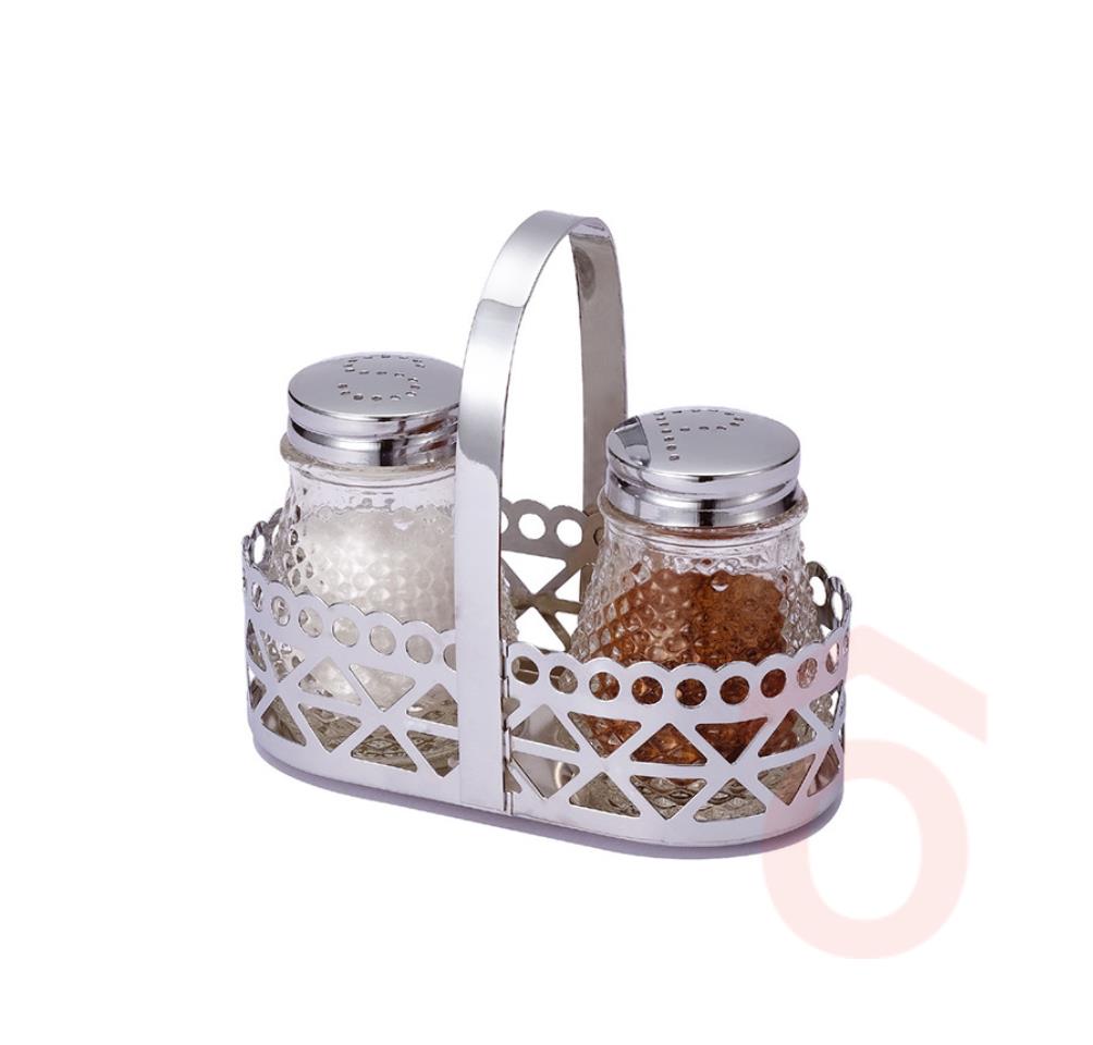 2 részes üvegből készült fűszertartó készlet, rozsdamentes acél fejjel, sóhoz és borshoz, fém füles tartóval.