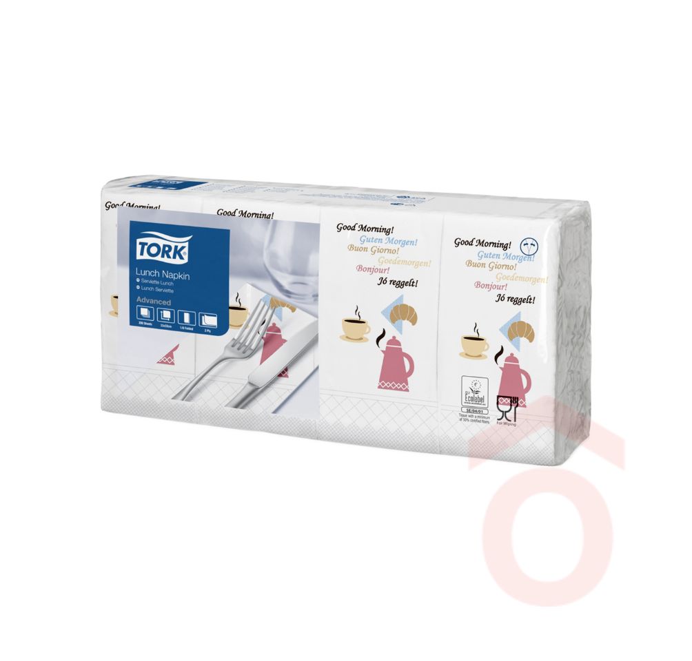 A Tork Lunch „Jó reggelt” mintás szalvéta kiváló választás reggeliztetéshez vagy vendéglátóhelyek nyitásához, ahol fontos a pozitív vendégélmény kialakítása. A 2 rétegű, 1/8 hajtású kivitel praktikus, a „Jó reggelt” feliratú dizájn pedig figyelmes üzenetként hat a vendégek számára.