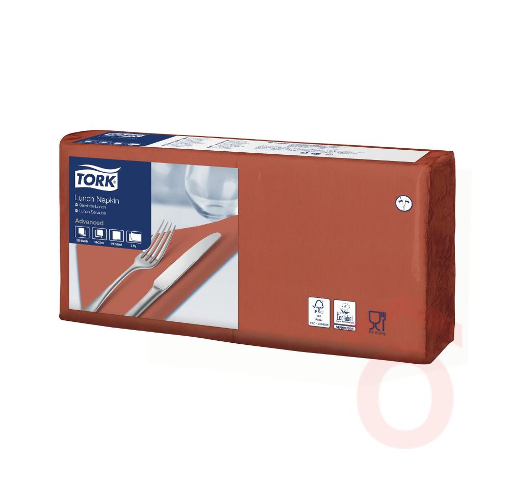 A Tork Lunch szalvéta praktikus és dekoratív választás könnyű ételek mellé. A terrakotta színű, 2 rétegű szalvéta elegáns megjelenést ad az asztalnak, miközben strapabíró kialakítása biztosítja a megbízható használatot kávézókban, éttermekben és büfékben.