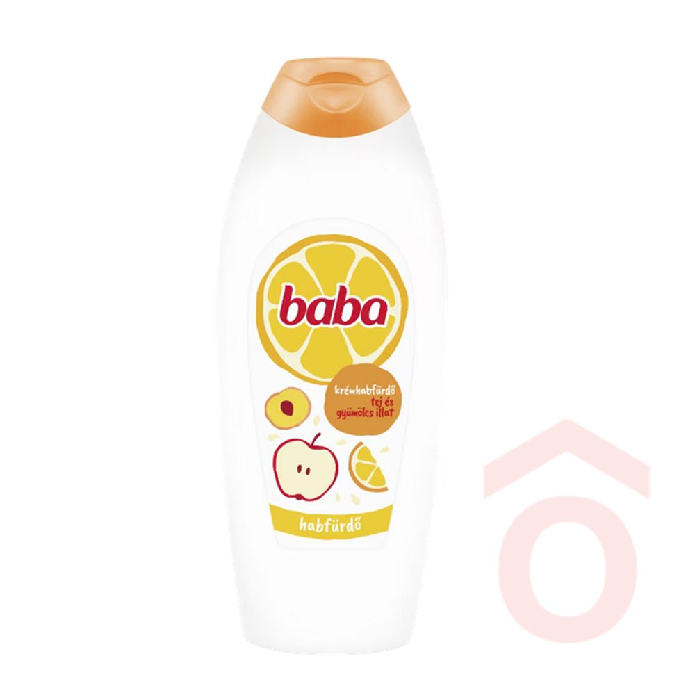 A Baba tej és gyümölcs illatú krémhabfürdő selymes habbal és gyengéd ápolással kényezteti a bőrt. Frissítő illatélményt és természetes összetevőkben gazdag formulát kínál, így tökéletes választás a mindennapos tisztálkodáshoz.