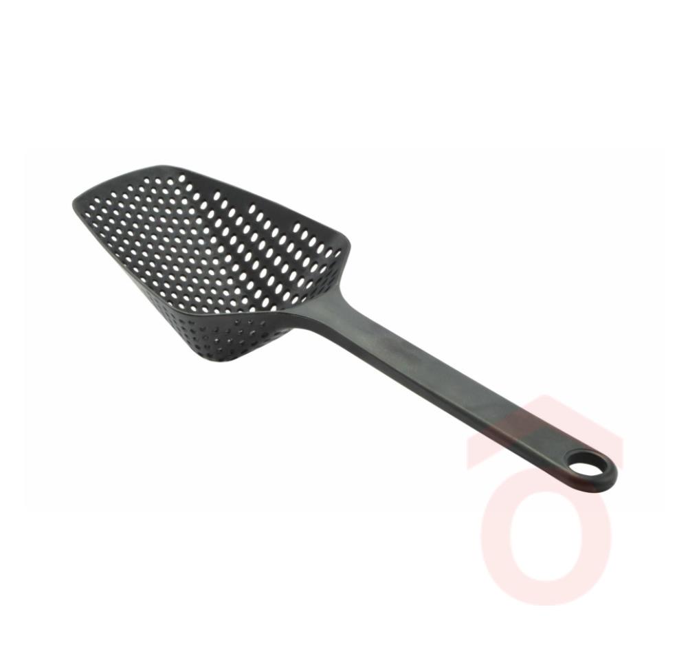 Ez a hosszúkás, lyukacsos rizs- és zöldséglapát ideális főtt rizs, zöldség vagy tészta kiszedéséhez és tálalásához. A műanyag kialakítás biztonságos tapadásmentes edényekhez is, a hosszanti nyílások pedig lehetővé teszik a víz könnyű lecsepegését. Ergonomikus nyéllel ellátott, akasztható kialakítással.