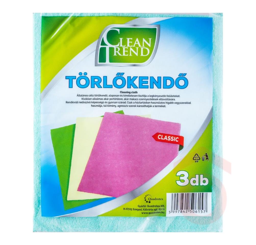 Kiváló ár/érték arányú általános háztartási törlőkendő mindennapos használatra, csökkentett mérettel. Terméktípus: törlőkendő Kiszerelés: 3 db Szín: zöld, sárga, rózsaszín méret: 33 x 38 cm Márka: Clean Trend