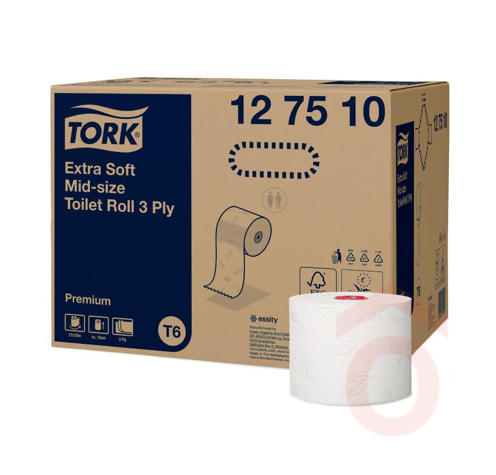 A Tork Extra Soft Mid-size toalettpapír ideális választás alacsony és közepes forgalmú mosdókhoz, ahol fontos a vendégek maximális komfortja és a higiénia. A duplatekercses T6 adagolórendszerrel használva folyamatos papírellátást biztosít. Rendkívül puha és extra fehér megjelenése eleganciát kölcsönöz a mosdónak. Látványos mintázata kifinomult megjelenést nyújt, miközben a Tork Easy Handling® doboz megkönnyíti a szállítást és a hulladékcsökkentést. Minden tekercs 4-5 hagyományos kis tekercsnek felel meg, ezáltal csökkentve az utántöltések számát.