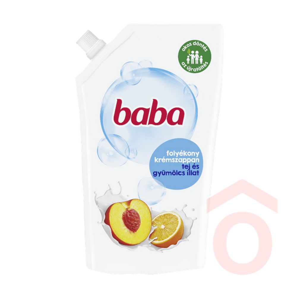 A Baba folyékony szappan utántöltő tej és gyümölcs illattal kényezteti a kezeidet minden használatkor. Gyengéd krémszappan bőrbarát formulával, amely alaposan tisztít, miközben óvja a bőrt a kiszáradástól.