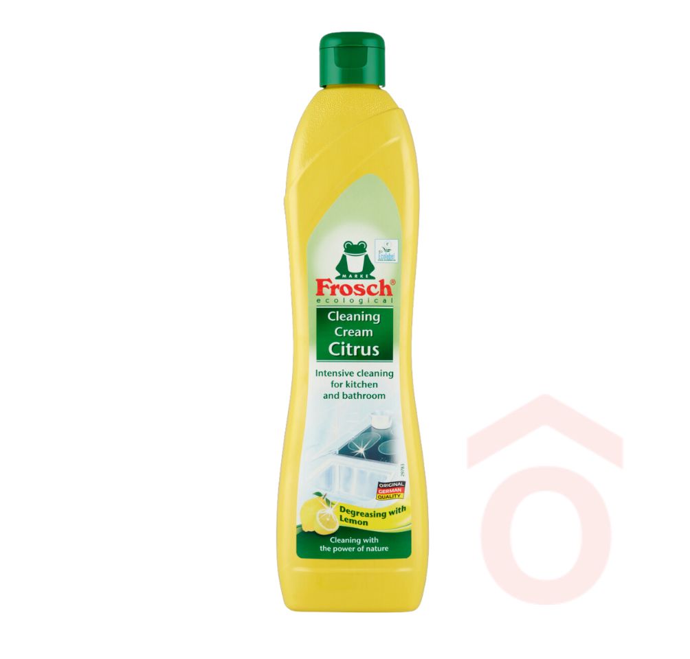 A Frosch citromos súrolókrém hatékonyan távolítja el a konyhai és fürdőszobai szennyeződéseket, miközben kíméletes marad a kezelt felületekkel és a bőrrel. Természetes márványliszttel és citromkivonattal biztosít higiénikus tisztaságot.
