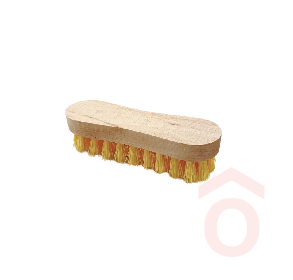 Kis méretű piskóta alakú, fa testű súroló kefe, műanyag szálakkal, nélkülözhetetlen takarítóeszköz a foltok és szennyeződések eltávolításához.