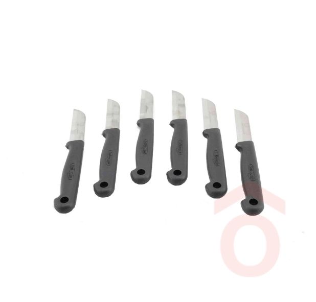 Praktikus hámozókés szett 6 darabos kiszerelésben, 6 cm hosszúságú, enyhén ívelt pengékkel. A rövid penge kiválóan alkalmas zöldségek és gyümölcsök gyors, pontos hámozására vagy darabolására. A műanyag nyél kényelmes fogást biztosít, kialakítása stabil és biztonságos használatot tesz lehetővé.