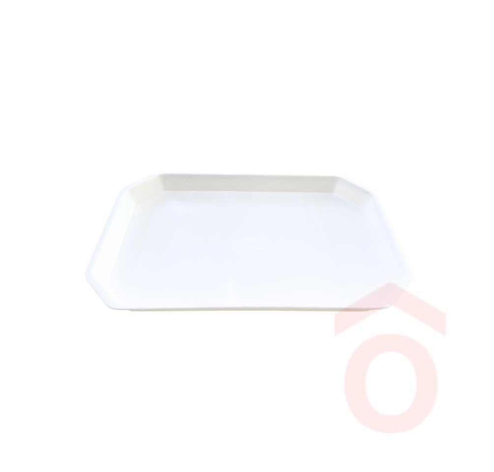 Szögletes formájú, sarkosított kis méretű, műanyag tálca.
