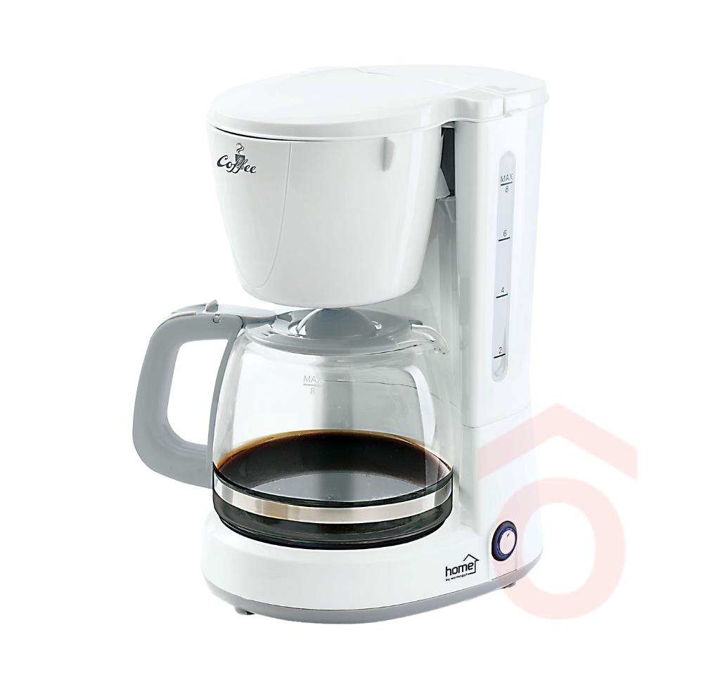 A Home by Somogyi kávéfőző masszív fehér műanyag borítással és csúszásmentes szilikon talppal rendelkezik, 1 literes, 8 csészényi víz befogadására alkalmas átlátszó víztartállyal. Az üvegkancsó hőszigetelt fogantyúval van ellátva a kényelmes használathoz.