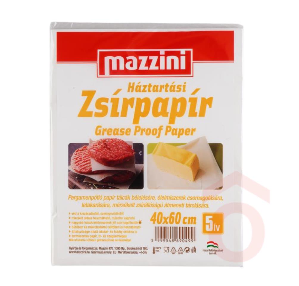 A Mazzini zsírpapír kiváló választás élelmiszerek, például húskészítmények, sütemények vagy szendvicsek csomagolásához és letakarásához. Anyaga zsirálló és korlátozott ideig vízálló, így megbízható védelmet nyújt a frissesség megőrzéséhez. Hűtőszekrényben és mikrohullámú sütőben is használható (grill funkció nélkül).