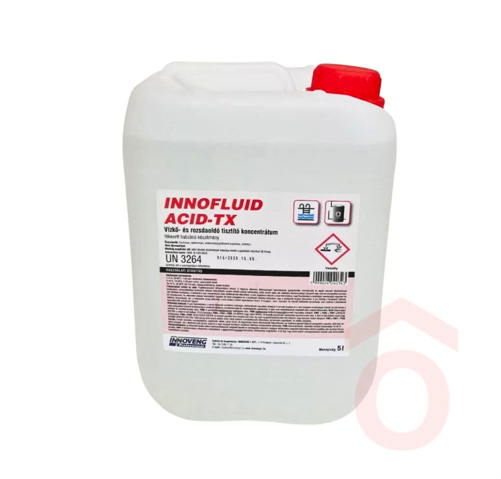 Az Innofluid Acid-TX egy nem habzó, savas tisztítószer koncentrátum, amelyet kifejezetten ipari és élelmiszeripari felhasználásra fejlesztettek ki. Hatékonyan oldja a lerakódott vízkövet, tejkövet, borkövet, fémoxidokat és karbonátokat, miközben a felületaktív anyag eltávolítja a zsíros szennyeződéseket is. Alkalmazható tartályokban, csővezetékekben, gyógyfürdőkben, ivóvíztárolókban vagy más nehezen hozzáférhető rendszerekben. A szer hígításakor először mindig a vizet kell kimérni, majd ehhez adagolni a koncentrátumot. Használat után alapos öblítés szükséges.