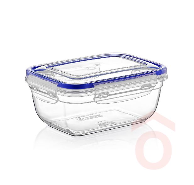 Átlátszó, szögletes műanyag tárolódoboz 800 ml űrtartalommal, praktikus patentzárral és beépített szilikon tömítéssel. Hőálló –25 °C és +95 °C között, mikrohullámú sütőben is használható, így ideális ételek elvitelére és frissen tartására.