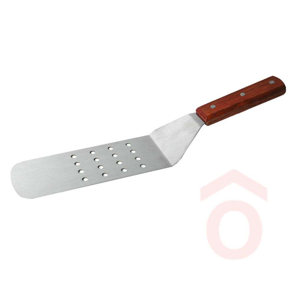 Rozsdamentes acélból készült spatula, fa nyéllel. Az acél lap szélessége 7,3 cm, hossza 25 cm, teljes hossza 37 cm. Sütőfelületen készülő ételek megfordítására használt konyhai eszköz. Karcmentes, folyékony mosószerrel tisztítható.
