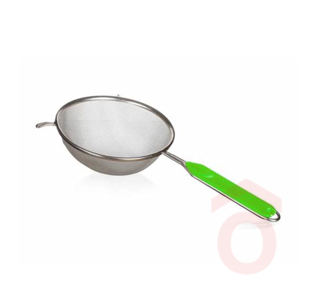 Extra nagy méretű kézi szűrő 19,5 cm átmérővel, ideális nagyobb mennyiségű folyadék, zöldségleves vagy befőttlé szűréséhez. A sűrű, 1×1 mm-es fémszövet biztosítja a hatékony szűrést.