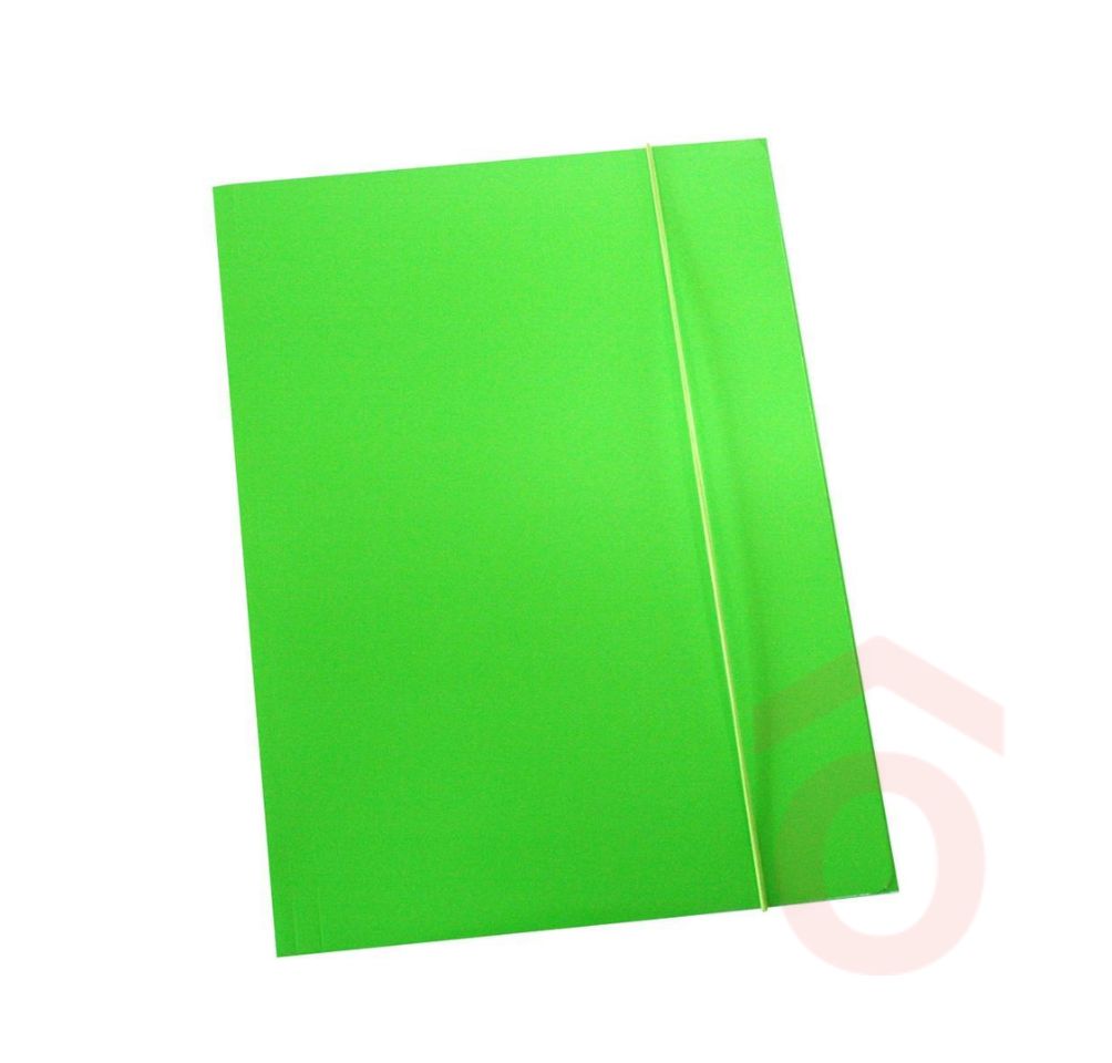 600 grammos kartonból készült, kívül vidám, neon színekre lakkozott, belül a borítóval azonos színű , gumis mappa 3 pólyával, hosszanti oldalán gumiszalaggal ellátva. A gumiszalag színe megegyezik a mappa színével. Kisebb mennyiségű papír tárolására alkalmas.