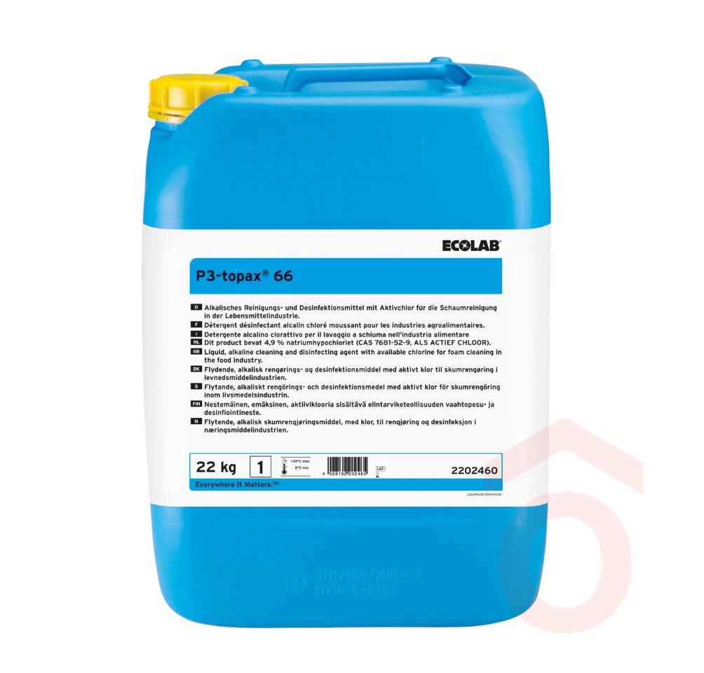 A P3 Topax 66 egy habosítható, nagyteljesítményű tisztító- és fertőtlenítőszer, amely kiválóan alkalmazható nagynyomású mosókkal vagy habosító tartályokkal történő felhordásra. Hatékonyan eltávolítja a zsíros szennyeződéseket, miközben megbízható fertőtlenítő hatással is rendelkezik. Különösen hidegvizes nagynyomású berendezésekhez ajánlott, ahol fontos a gyors és hatékony higiénia fenntartása.