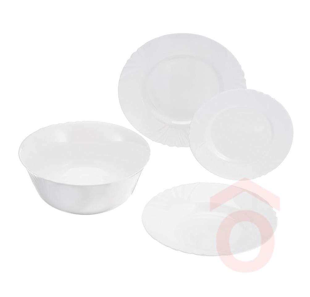 Ez az opál üvegből készült étkészlet hosszú ideig örömet fog okozni. A készlet egy nagy salátástálat is tartalmaz. Az anyag tartósabb a porcelánnál, tiszta fehér, és rendkívül könnyű. Mosogatógépben és mikrohullámú sütőben is használható. A tányérok és a tál érdekes dombornyomott mintával rendelkeznek, díszítés nélkül.
