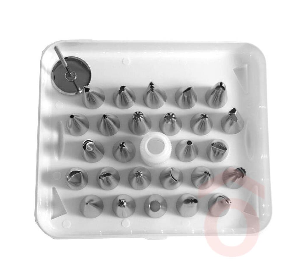 Rozsdamentes acélból készült 26 darabos habcső készlet, sütemények díszítéséhez, műanyag tároló dobozban. A készlet tartalma: 26 db díszítőcső, 1 db műanyag habzsák csatlakoztató, 1 db virágszög.